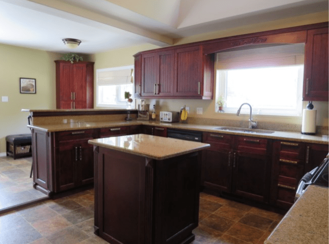 There’s an addition at the back of the kitchen that houses a separate laundry area, a bar, a small seating nook, and our TV mounted on the back wall. The kitchen was nice, but I’ve never loved cherry wood—it has a red tinge that I’m not fond of. I also prefer shaker-style cabinets over Santa Fe; I like clean lines rather than ornate details. Between the decorative columns under the eat-in area, the dental moulding above the cabinets, the dark flooring, and the wall colour, the space felt heavy and dark.