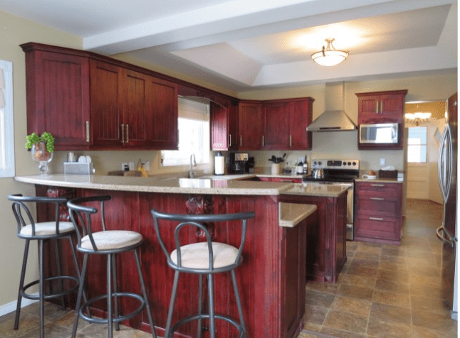 The kitchen had been newly installed by the previous owners. The cabinets were Santa Fe–style with a cherry finish, granite countertops, stainless steel appliances, and vinyl flooring with a tiled pattern. While it all matched nicely, it just wasn’t me.