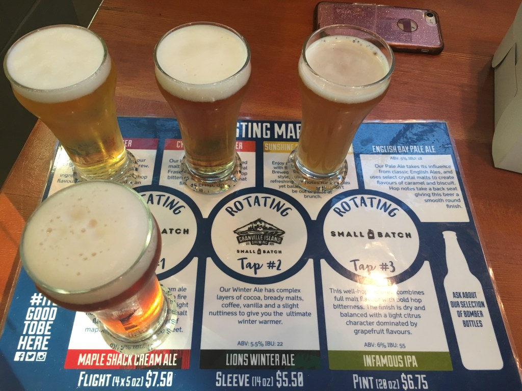 We enjoyed the view while we ate the yummiest New York cheesecake from one of the market vendors on the boardwalk and then went to enjoy a flight of handcrafted premium beers at Granville Island Brewing.