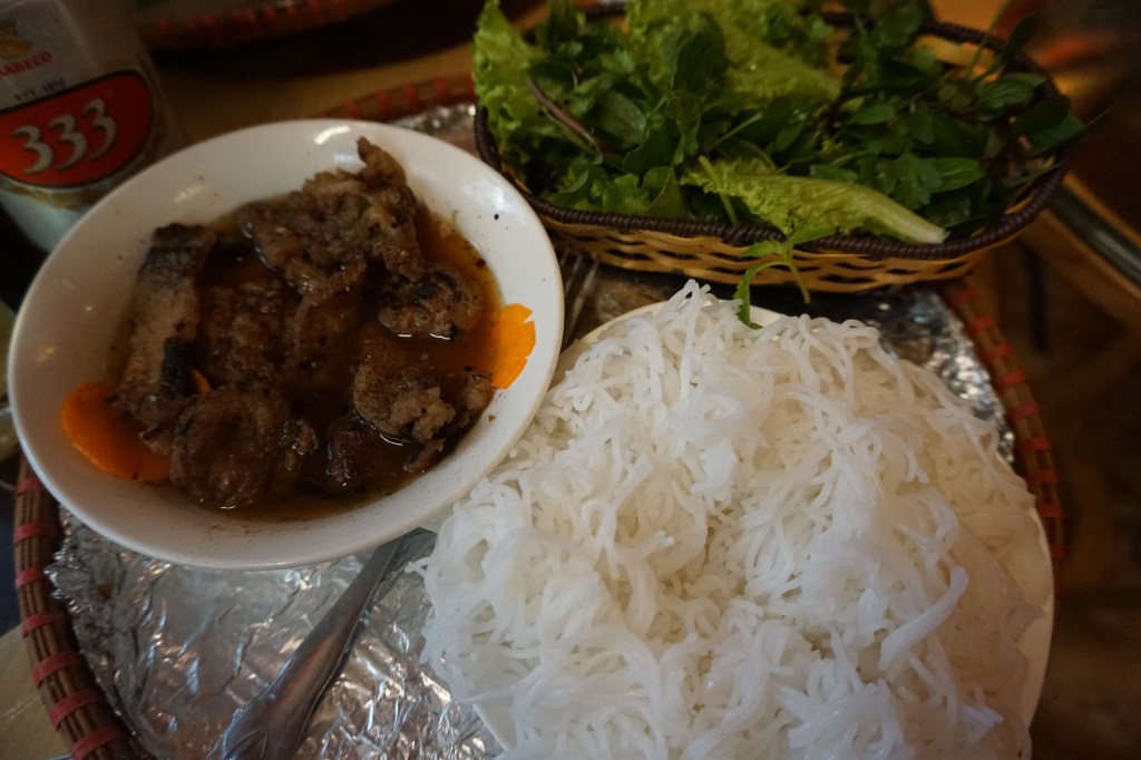 (1) Bún chả – served with grilled fatty pork (chả) over a plate of white rice noodles (bún) and herbs with a side dish of dipping sauce. I ate this twice while in Vietnam. Definitely worth trying, guys! It was super good!