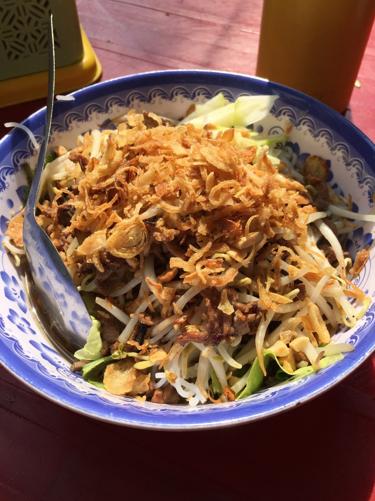 (4) Bun Bo Nam Bo – could be the best street food in Ha Noi – the broth at the bottom of the deep bowl is made of fish sauce, sugar, lemon and chilli and has deliciously light, sweet and sour undertones. The sauce is topped with marinated beef, vegetables, noodles, onion crisps and crushed nuts.