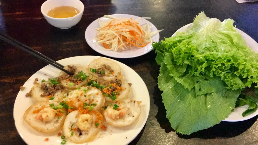 (3) Bánh khọt – if you love crispy savoury pancakes, you’re going to love Vietnamese bánh khọt – it’s usually provided with lettuce, tons of herbs and dipping sauce – really good. Equally as yummy in the pancake department is bánh xèo.