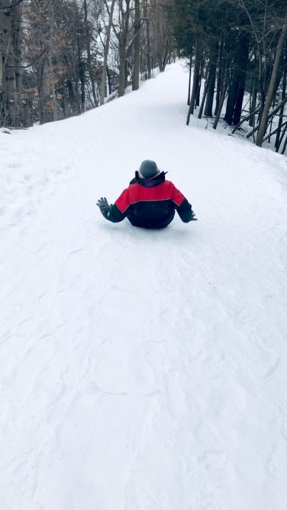 The second part of the trek, with the snow, the cold and sledding down the larger hills rather than trekking down them, took us about 2h45 mins.