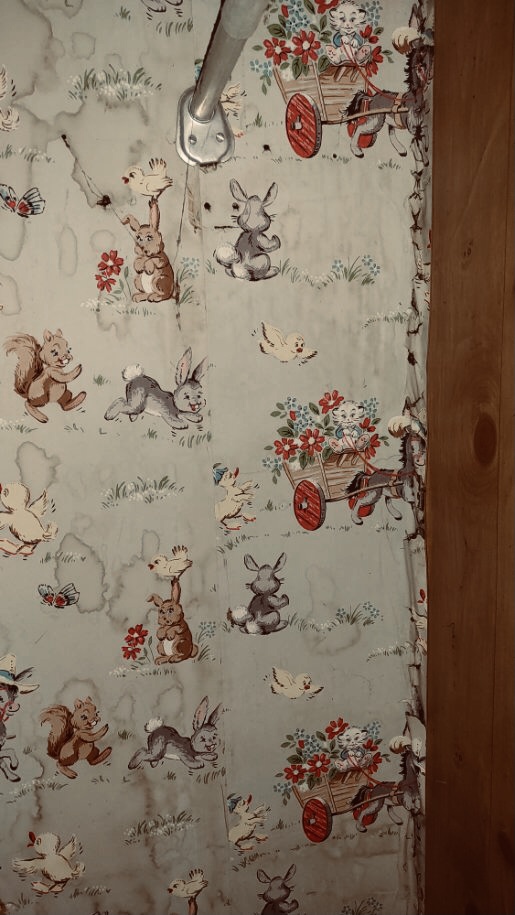- Interesting wallpaper still clinging to the walls, a glimpse of the home’s former personality.