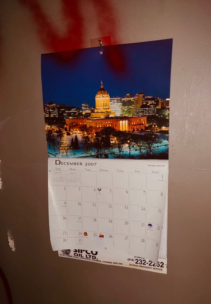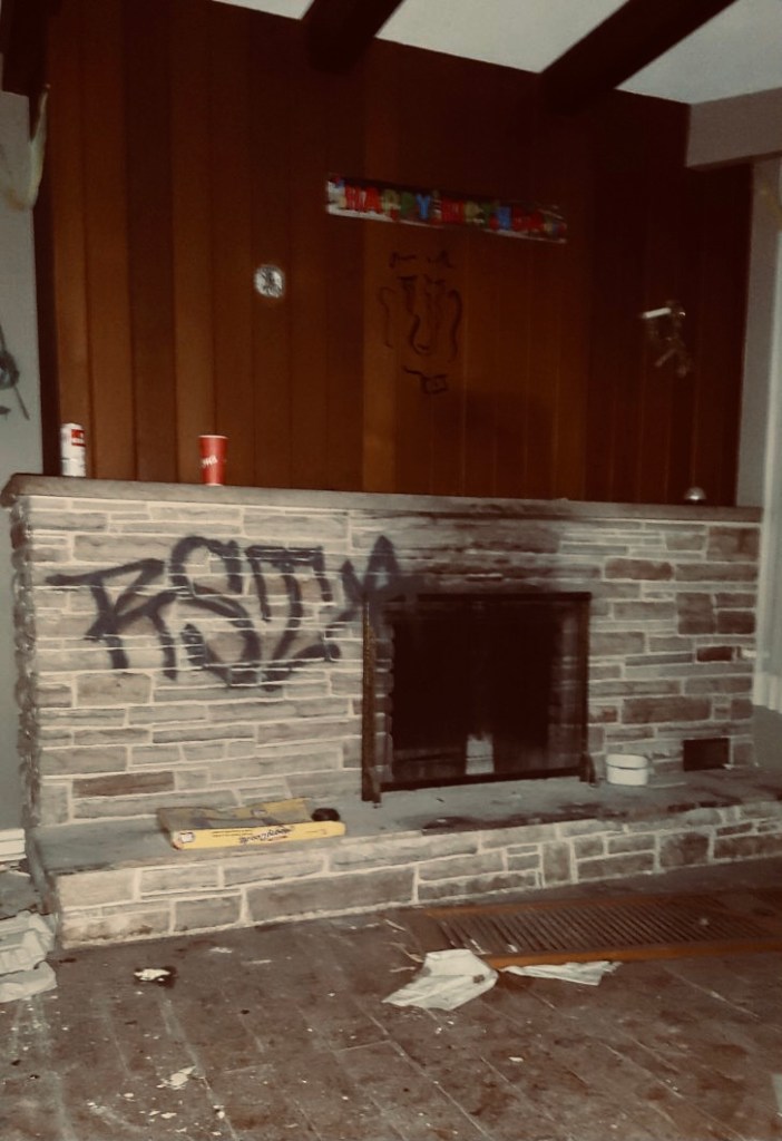 Inside, the house appears ransacked and vacant, having been so since around 2007, with the last calendar I found marked December 2007. The kitchen has a distinct 1970s/80s vibe and is heavily vandalized, with broken cabinetry, scattered debris, and graffiti covering the walls.