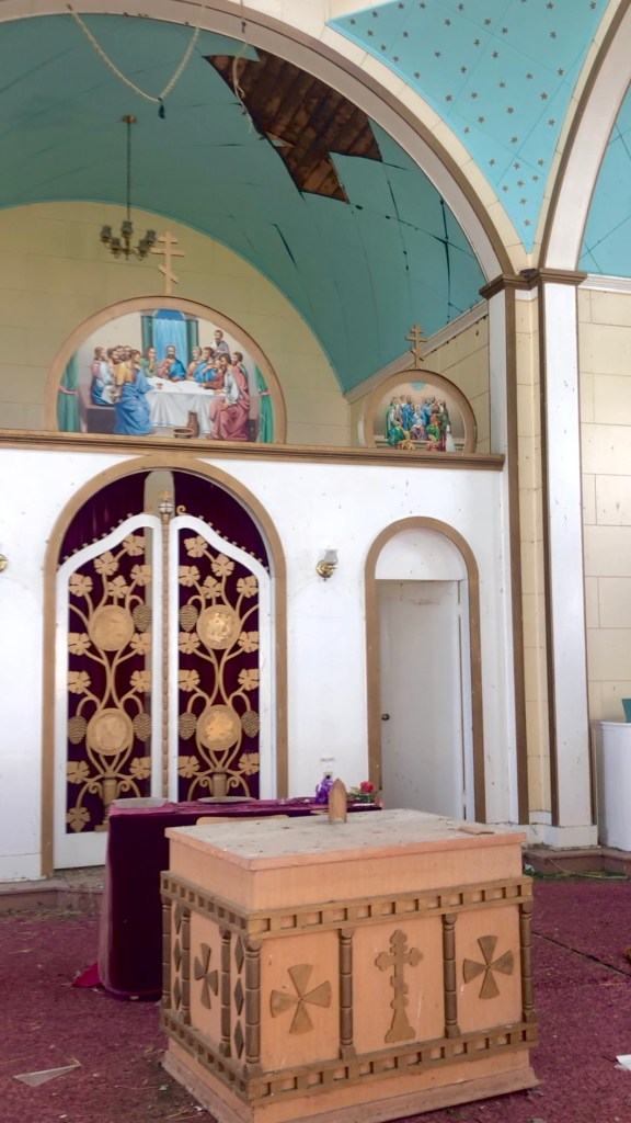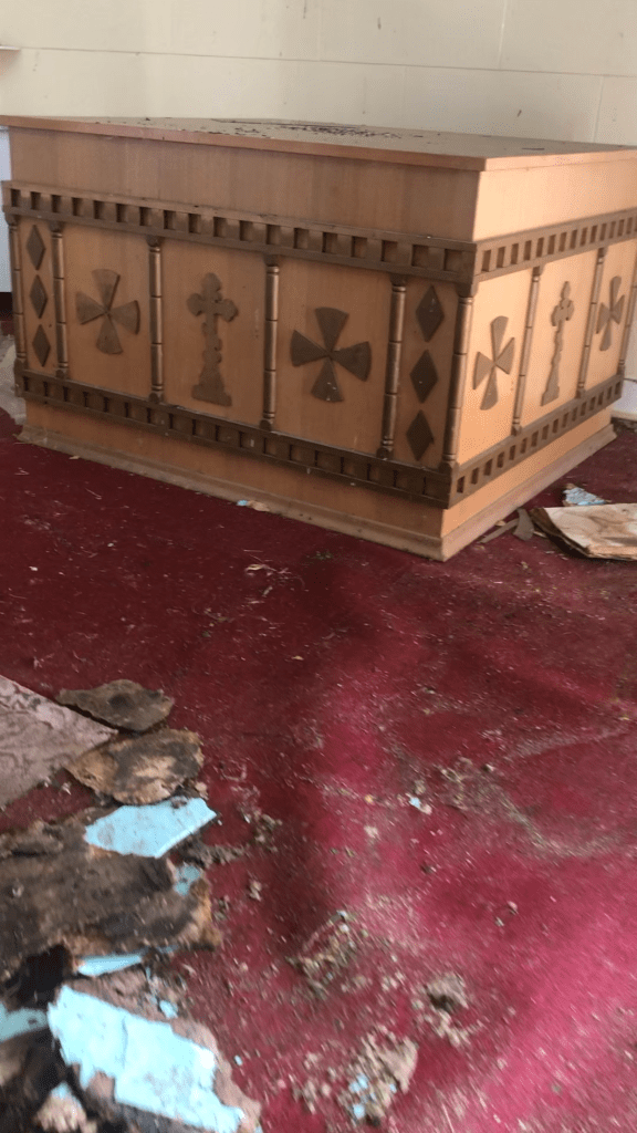 The centrepiece of my visit was the Ukrainian Orthodox Church of the Holy Ghost, built in 1942. Its distinctive domed roof hints at the Eastern European heritage of the settlers. Over time, as the population declined, the congregation dwindled, and the church was eventually abandoned. Originally boarded up and relatively intact, it later suffered vandalism and weather damage, leaving broken windows and graffiti where icons and pews once were.