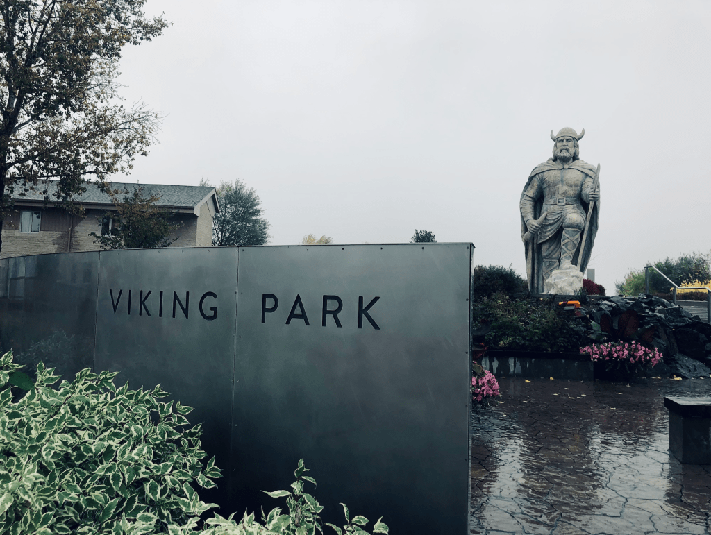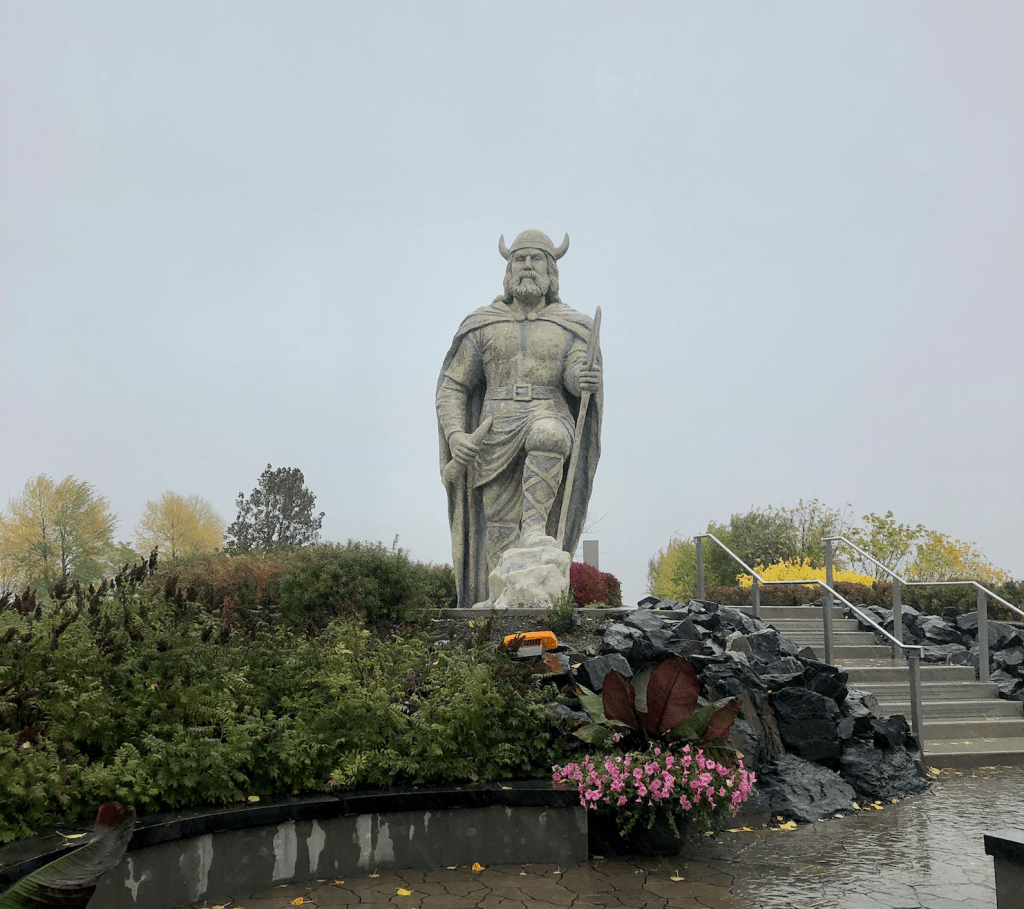 I stopped in to take a selfie with The Viking Statue, and it was pouring down rain. Regardless, I got out and got soaked to take a few photos (no selfies). The five metre tall statue stands in the centre of the small Viking Park.