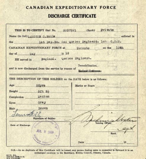 After being discharged from the military in July 1919, Émile returned to Bonfield, Ontario, resuming civilian life.