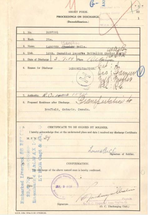 Finally, the 10th Battalion returned to Canada on June 24, 1919, and was formally disbanded on July 2, 1919. For Émile, this marked the end of his overseas service, the conclusion of the war experience that had shaped his early adult years, and the beginning of his journey back home to Bonfield.