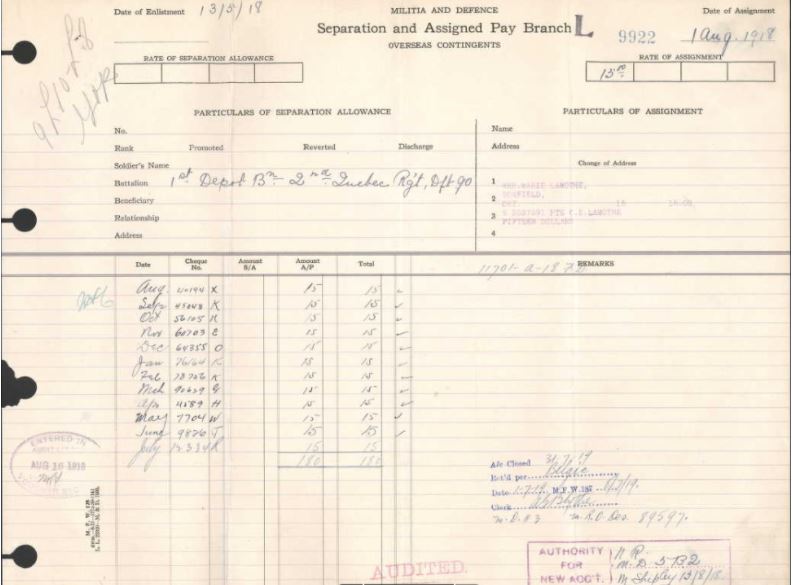 July 26, 1919: Émile was officially authorized to receive The British War Medal. This medal was awarded to all ranks of Canadian overseas forces who had served abroad between August 5, 1914, and November 11, 1918, or who had been in a theatre of war. In total, 427,993 medals were issued to members of the CEF.