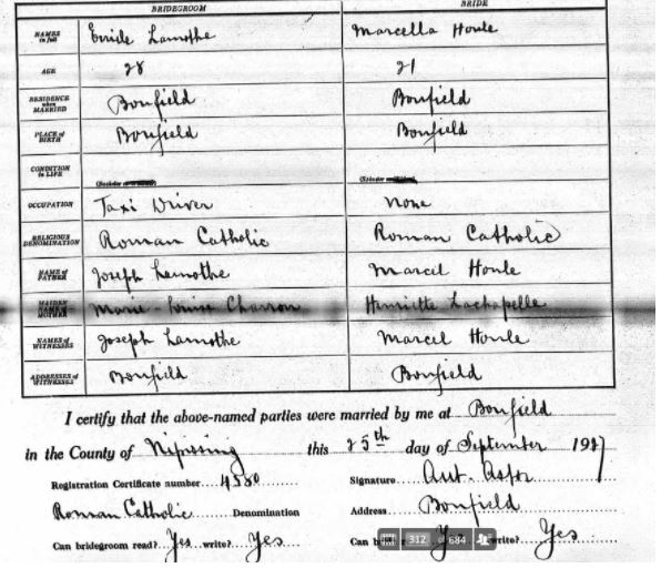 Cleophas Émile Lamothe (he went by Émile) was born on June 10, 1897, in Bonfield, Ontario to Marie Louise Charron (38), and Joseph Magloire Lamothe (42). For those of you who don’t know where Bonfield is (and I don’t blame you, I’d be more surprised if you actually knew where it was), it’s a small township in Northeastern Ontario, located on the north shore of Lake Nosbonsing in Nipissing District.