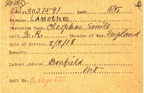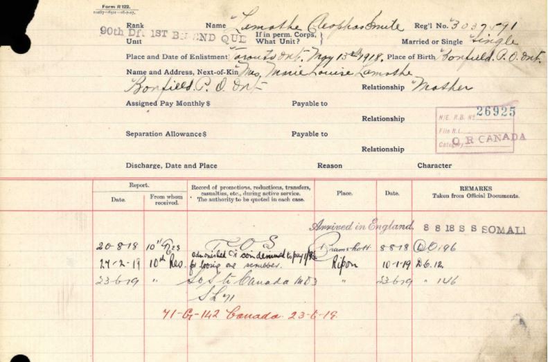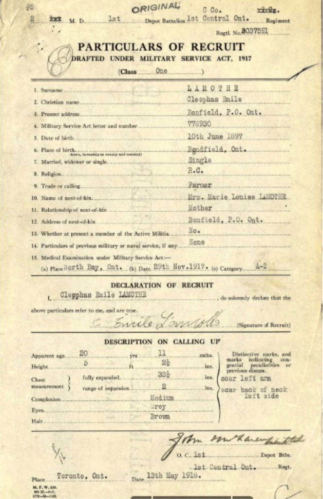 Émile was examined on November 29, 1917, and called up on May 13, 1918, to the 1st Depot Battalion, 1st Central Ontario Regiment, assigned Regimental #3037591, and held the rank of Private. At the time, he was 20 years and 11 months old, stood 5’2.5″, and was a single farmer.
