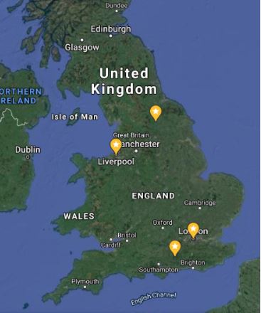 Here’s a map of where I’ve been able to locate Émile while in the UK (pinned are Ripon, London, Liverpool and Bramshott).