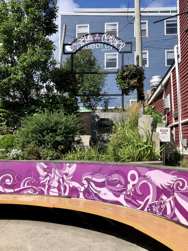 The artwork at Solomon’s Lane is titled “(in)habit.” It’s inspired by the traditional visual language of quilting and has helped create a visually stunning and inviting space, which is located just outside the Craft Council building and connects Water and Duckworth Streets.