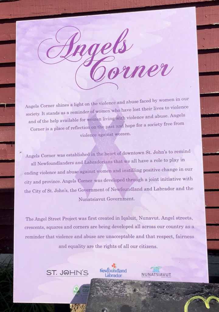 Angels Corner is located at the intersection of Duckworth and Prescott Streets. The memorial, which is part of a national initiative, recognizes female victims of violence and creates awareness of the need to end violence and abuse against women.