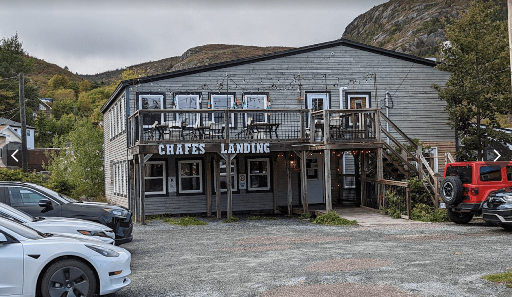 Highly recommended, I chose Chafe’s Landing for lunch. They were touted for their seafood chowder, cod tacos and fish & chips. This cute little place was just as you’d expect in a small fishing village. An old building with great atmosphere and good food. Loved the upstairs deck view overlooking the harbour, where I enjoyed my lunch of Moose Madness: fries topped with ground moose and moose sausage, sautéed mushrooms, onions, green peas, dressing, and gravy.