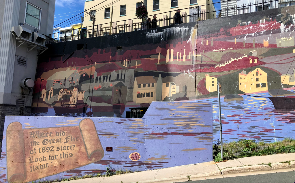 A mural on McBride’s Hill shows the Great Fire of 1892 by Artist Julie Lewis.