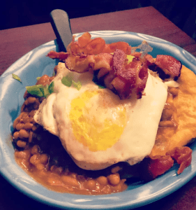 No doubtin’ I’m having a touton for breaky at the Bagel Cafe on Duckworth St. It came highly recommended. I opted for the Cape Spear touton, which came with Cape Spear beans, touton, fish cake, eggs and bacon. I topped it with maple syrup – yum! It paired well with a green tea mimosa.