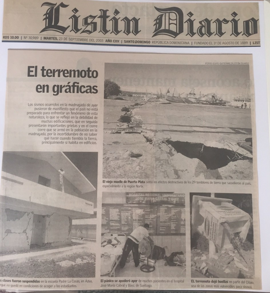 According to the newspaper articles from the paper that Freddie picked up for me, the earthquake was reported as a strong magnitude 6.5 and was felt over most of the country. It caused significant damage in the cities of Puerto Plata and Santiago and was felt as far as Port-au-Prince, Haiti, and even western Puerto Rico, some 354 km east. This quake was one of a series of westward-propagating earthquakes along the boundary between the North American Plate and the Caribbean Plate. So that confirms it, we were in fact in the epicenter.